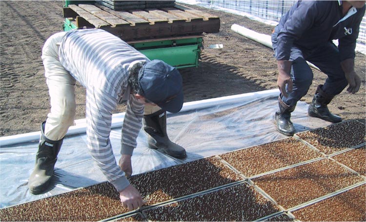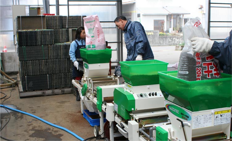 芽だしをした種もみを田植え用の育苗箱へまきます。種もみまきは機械を使い、種もみが均一になるようにします。