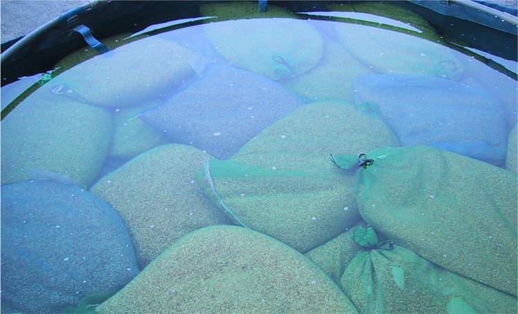 水に食塩を入れ、その中で種もみを洗います。(水10リットルに対して食塩1.9kg)塩水洗をすることにより、実の詰まってない種もみは軽いので浮かんで来ます。こうやって質の良い稲を育てるために、強い種もみを選別します。- 種もみ芽だし(3月下旬~4月上旬)