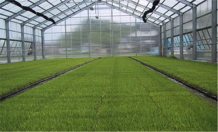 種まき後、約5週間苗を育てます。苗は暖かい育苗用のハウスの中に並べられます。 毎日の水の管理と、温度管理は欠かせません。注意を払いながら苗の生長を見守ります。三週間ほどで苗箱から青々とした苗が顔を出します。田植えに適した長さになるまで、ハウスの中で苗を育てます。