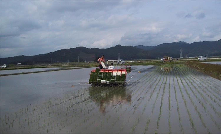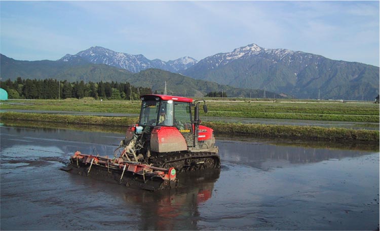 田起こしした田に水を入れ、田んぼ表面が平坦になるようにします。うまく平らにするには、長年の経験と技術が必要です。- 田植え・元肥まき(5月下旬~6月上旬)