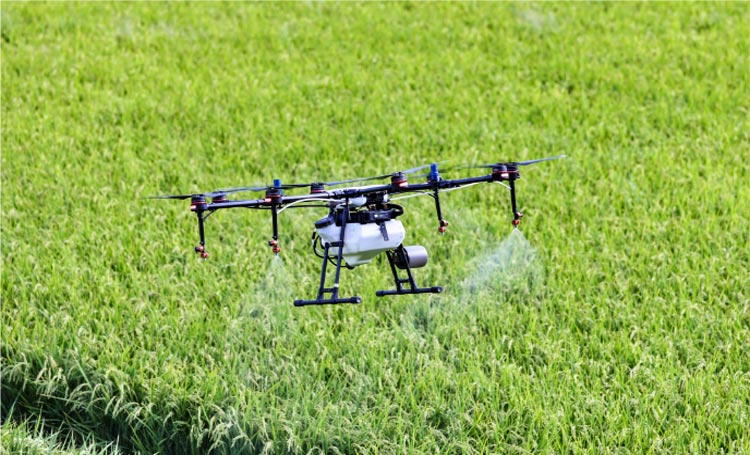 いよいよ田植です。田植え機を使い、苗を田んぼに植え付けます。この時一緒に植えた苗が順調に育つように元肥もまきます。- 除草剤散布