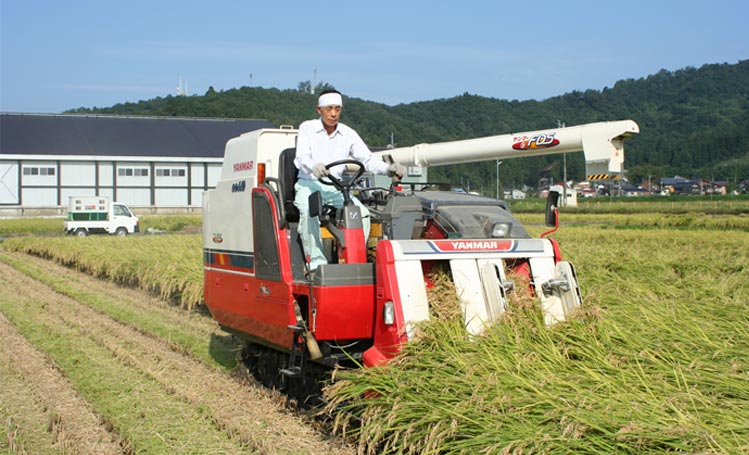 コンバインを使い稲刈りを行い、乾燥・調整を行います。